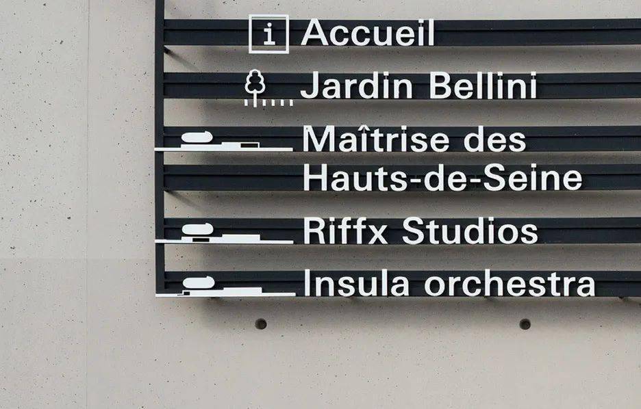 logo取自La Seine Musicale的首字母L、S、M,將其橫向延展, 暗示了獨(dú)出心裁的建筑造型。 文字和箭頭標(biāo)識(shí)宛如懸浮在空中一般。為了提高單一建筑的辨識(shí)度,將白色的刻字搭配在灰色混凝土和黑色面板之上。在人們最有可能迷路的地方,箭頭像千手觀音一樣指向四面八方,另外還設(shè)置了各式各樣的指示牌。