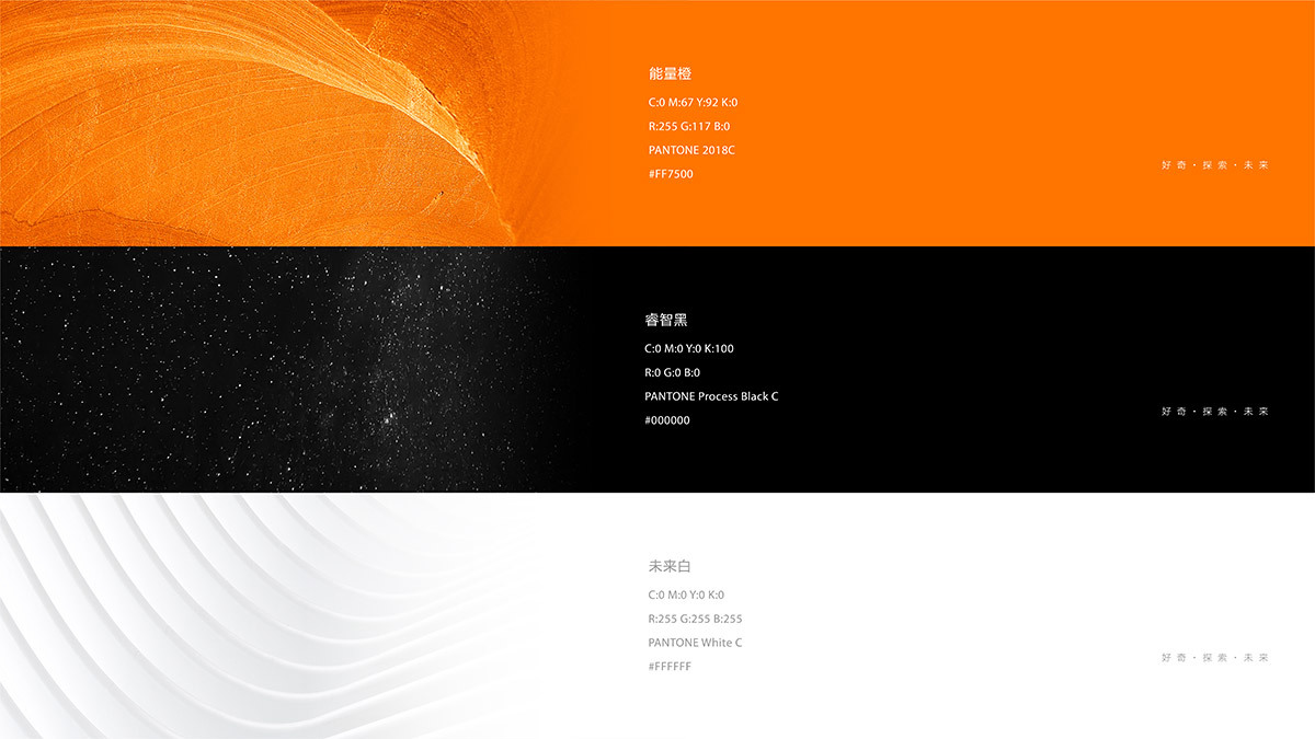 升級后品牌主色調(diào)繼承原有的橙色系,并提升色彩亮度,增添更多活力與能量。主色調(diào)“能量橙”,搭配“睿智黑”和“未來白”兩種輔助色彩,三者和諧搭配,共同構(gòu)成了圖拉斯品牌色彩系統(tǒng),同時也對應(yīng)展現(xiàn)品牌理念“好奇、探索、未來”。