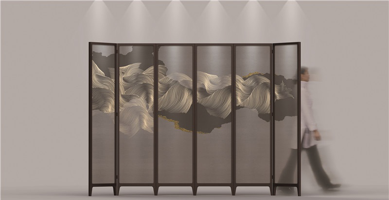 ▲ 水韻系列雙面繡落地屏風(fēng),由馬聰創(chuàng)作,以抽象簡(jiǎn)約的云水紋樣,結(jié)合中國(guó)非物質(zhì)文化遺產(chǎn)——雙面繡手工藝,或?yàn)椴ɡ藸?,似水流?dòng),或?yàn)樵茍F(tuán)狀,似隱似現(xiàn),以其飄逸靈動(dòng)、回轉(zhuǎn)交錯(cuò)的結(jié)構(gòu)表達(dá)了東方美學(xué)“疏密有致”的意境美感和“虛實(shí)有度”的審美張力。